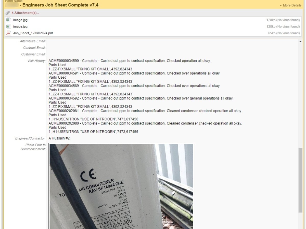 - Automatically created job sheets compliance certification, quotes photo capture, time on site, parts used, rates and customer signature